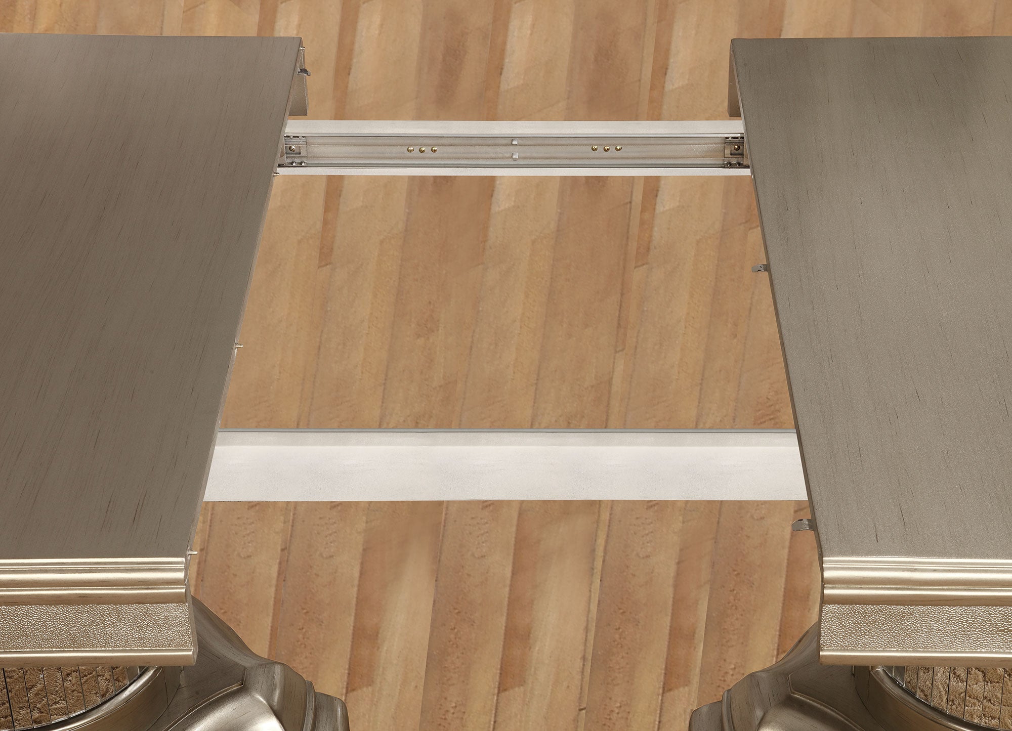 GLAMOROUS PLATINUM METALLIC NISH WITH HAND APPLIED HIGHLIGHT GLAZE DINING ROOM TABLE, WITH 4 SIDE CHAIRS AND 2 ARM CHAIRS. CRAFTED FROM ASIAN HARDWOOD.