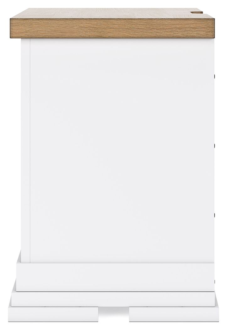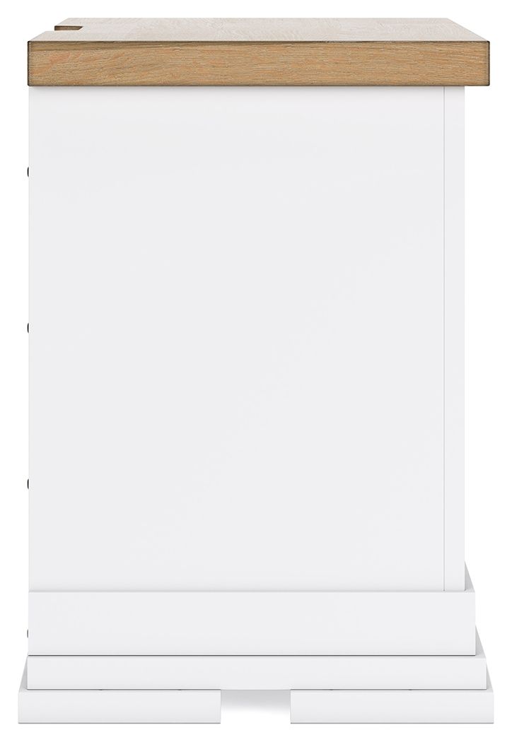 Casual style with substance. This two-tone nightstand raises the bar on comfortably cozy design in your soothing sanctuary. A sturdy silhouette with a classic white finish and black metal hardware exudes modern farmhouse vibes. The butcher block oak veneer top adds a relaxed aesthetic. And bedside charging for your go-to devices is made easy with power outlets and USB ports.