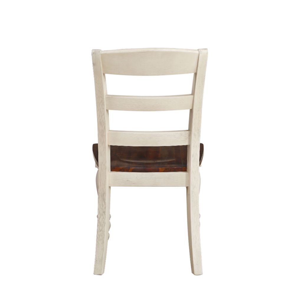 Armless Chair Stationary Seat: Standard Dining Height Wood BACK & SEAT Backrest: Ladder Style Wood Seat: Square/Scoop with Contrast Apron, Seat Size: 1 Inches Thick (20mm) Wood Turned Front Leg: Acacia Wood, Front Leg 3" x 3" (70 x 70mm), Back Leg 2" x 1.5" (50 x 38mm) Drawer: GLIDE Side Metal (Ball Bearing, 3/4 Ext.), DOVETAIL Back, Felt-Lined Drawer, Safety Stop Included, Self-Close, Hardware: Single Cup-Pull Finish: Distress Accent (Walnut Seat, White Apron, Backrest & Legs)