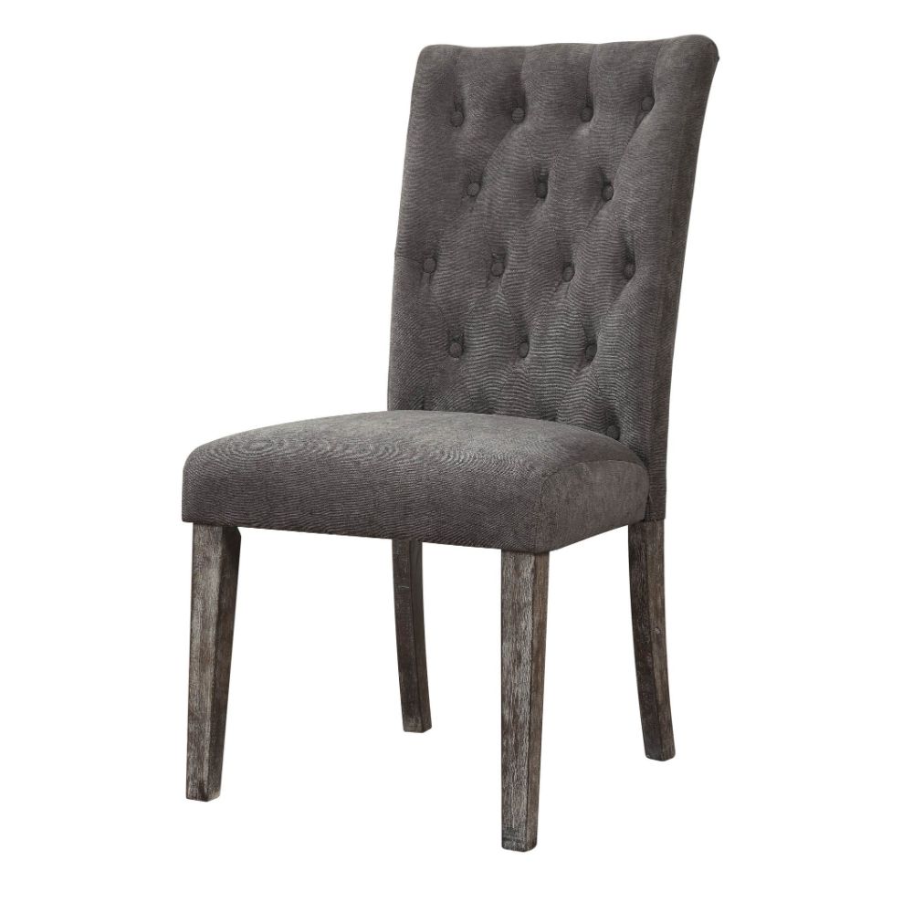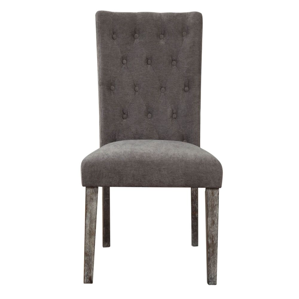 KD, Armless Parson Chair Stationary Seat Padded SEAT & BACK: Gray Velvet Cushion, Button Tufted (Inside Back) SEAT Cushion: Velvet, Foam, Spring Wood Tapered Leg: Reclaimed Gray Oak Finish, Rbw