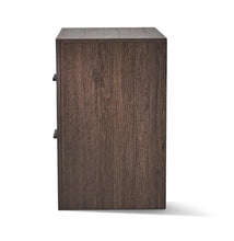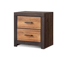Don't be surprised if you instantly fall for this transitional two-drawer nightstand with a rustic two-tone twist. It casts a warm aura that evokes Nature with reclaimed wood materials construction. The nightstand comes in a deep licorice finish that soothes the senses. Each drawer features a caramel finish with wood grain details and is adorned with a richly hued dark bronze metal pull handle. Solid legs and sides give it optimal stability and durability.