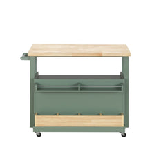 Add storage space and charm to your kitchen with this Harper wheeled kitchen island. The stylish green finish and natural wood top make this cart an adorable addition to cottage, contemporary or beach decor schemes. This modern kitchen island cart features ample storage for all your cooking needs with shelves, drawers, bottle holders and tower racks.