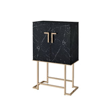 Contrasting elegance and modernity, this Hendrix wine cabinet is a functional piece that will definitely impress your guests. Expertly crafted with selected veneers, manufactured woods, and sturdy metal tube; it showcases a black faux marble with champagne finished base. The well-designed champagne handles reveal a wine bottle rack, which can store up to 14 bottles, and two shelves for glasses and other tableware. Perfect for dining rooms or entertainment spaces, this sophisticated piece is a must-have at your home.