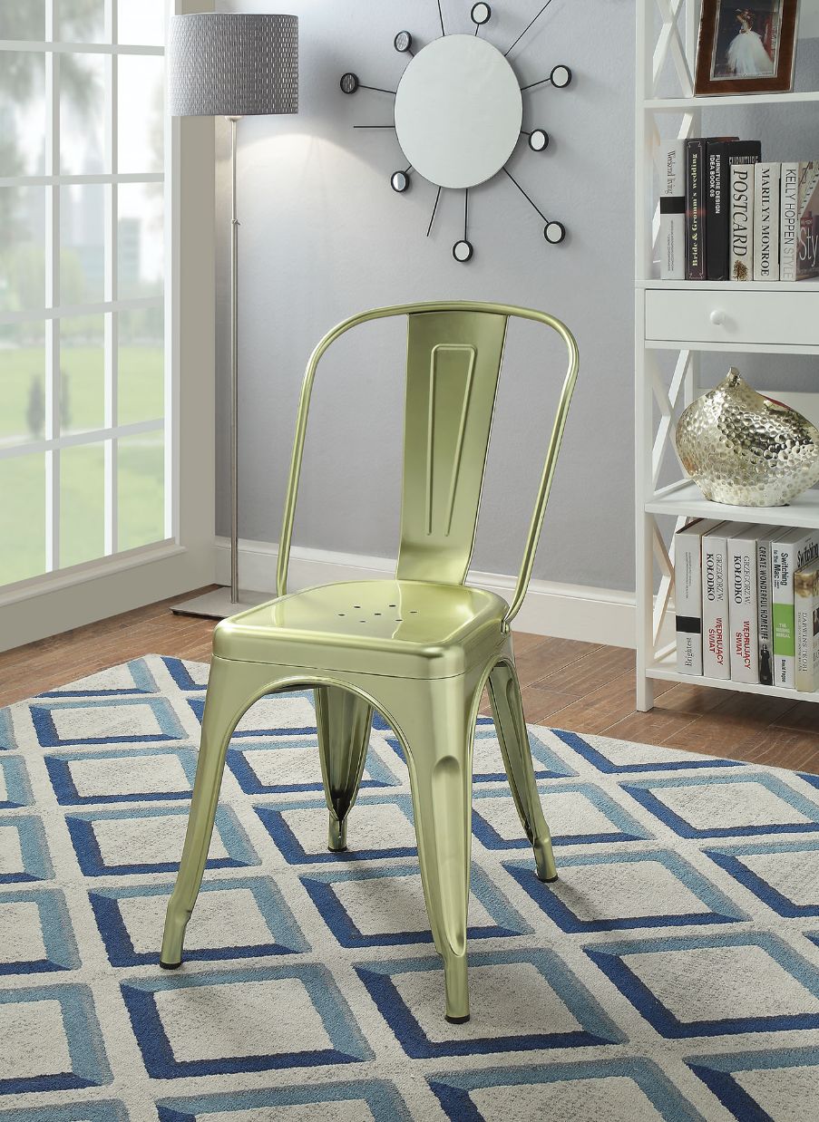 Completely transform your room or space with this Jakia style chair. Adding colorful chairs can rev up any setting. Its under-seat cross brace provides stability, and its lightweight design allows for easy movement and transportation. While its curved, armless, vertical slat back provides firm spinal support, ensuring you are at a comfortable height. All of metal, this chair is sure give you a feel of sturdy and durable enough to withstand years of use. There are 7 colors available: glossy rose gold, glossy gold, glossy orange, glossy brass, glossy blue, glossy champagne, and retro copper.