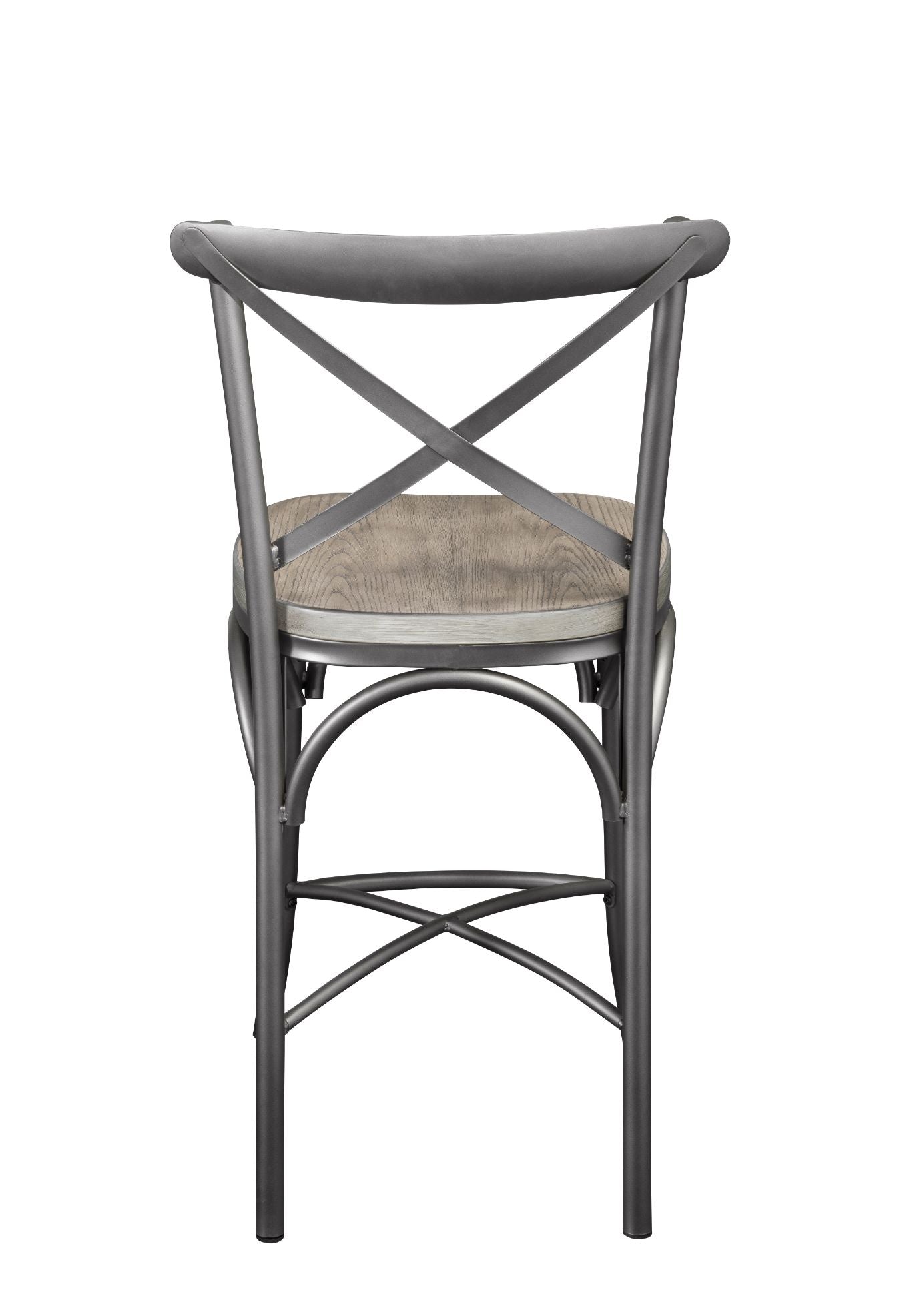 KD, Armless Chair (High Back) Stationary Seat Wooden Seat: Gray Oak Finish, Wood Veneer (Ash), MDF Metal Open Backrest: Curved Top, and "X" Shape Metal Leg and "X" Crossbar Supports (x3): Sandy Gray Finish, Round Metal Steel Tube (Thick: 1.0mm)