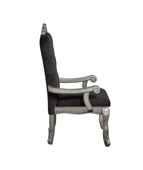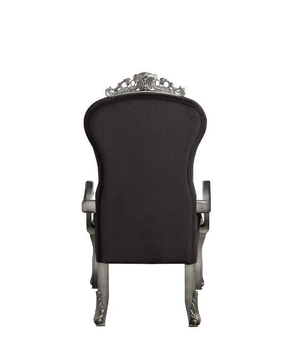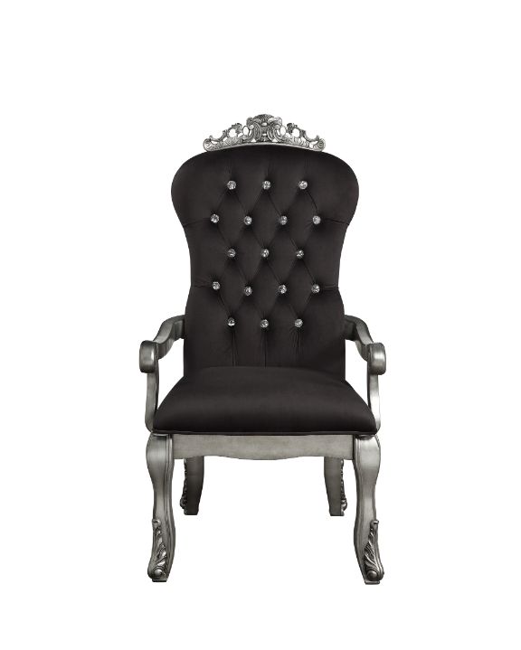 motifs and cabriole legs. The table features wooden top with scrolled-floral motifs and the chairs accents with crowns on top. Matching chairs are padded with deep taupe fabric and button tufted on the backrest. With the vintage platinum finish, it showcases the classic design while emphasizes the modish style.