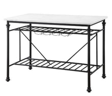 Give off a light and airy feel to a compact cooking space. The Mera Kitchen Island features a artificial stone top paired with a metal slatted shelves, creating a sleek, timeless silhouette that bring your kitchen an open feel. Bottle rack and wine glass storages keep your glassware and collection within reach. Use this stylish yet functional addition to complete your kitchen decor.