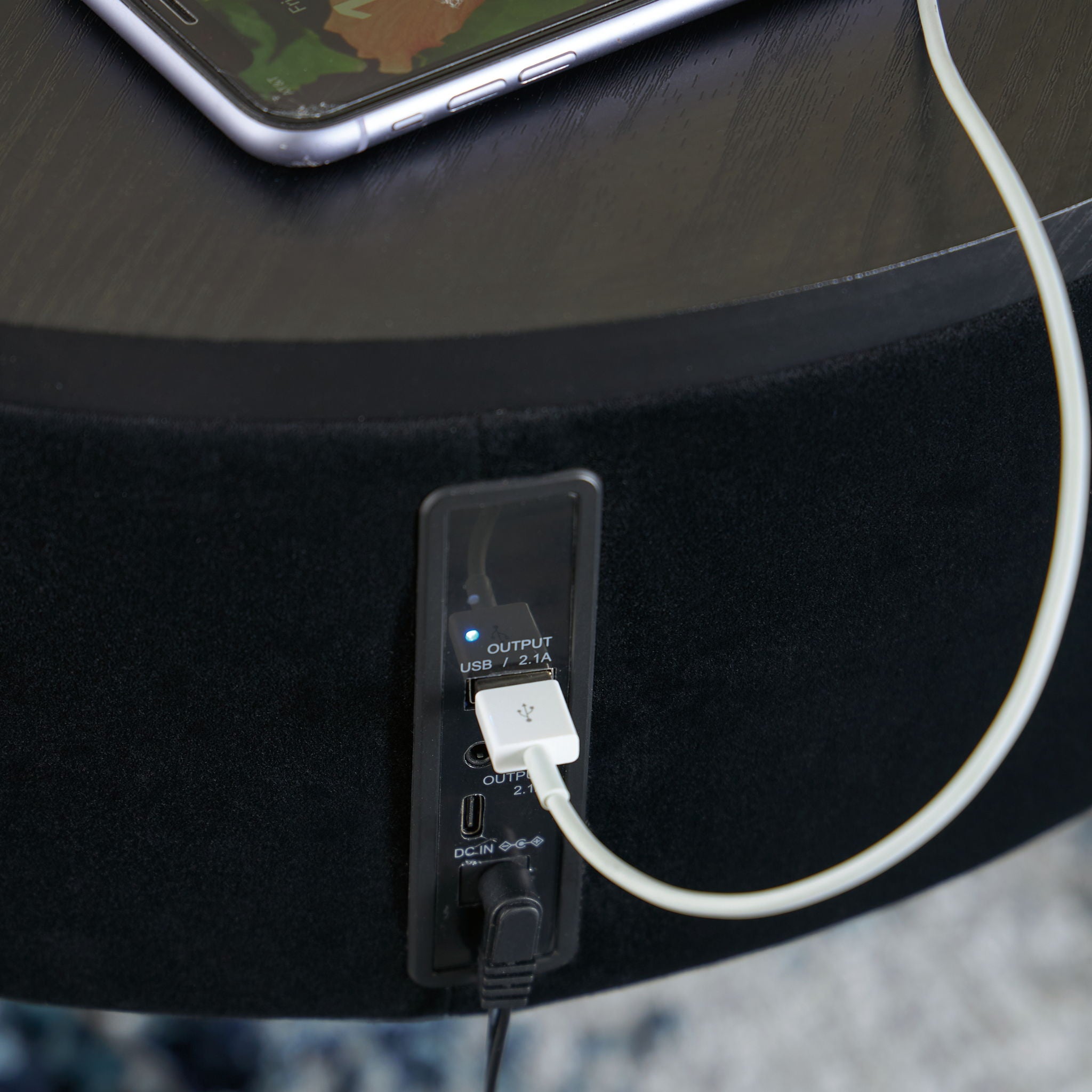 Discover the perfect combination of contemporary style and space-saving functionality. This accent table is designed with an integrated speaker (complete with wireless charging and touch-button controls), allowing you to effortlessly stream your favorite tunes wirelessly. Its sleek glass top perfectly complements the modern black fabric on the sides. This table is gonna be music to your ears.