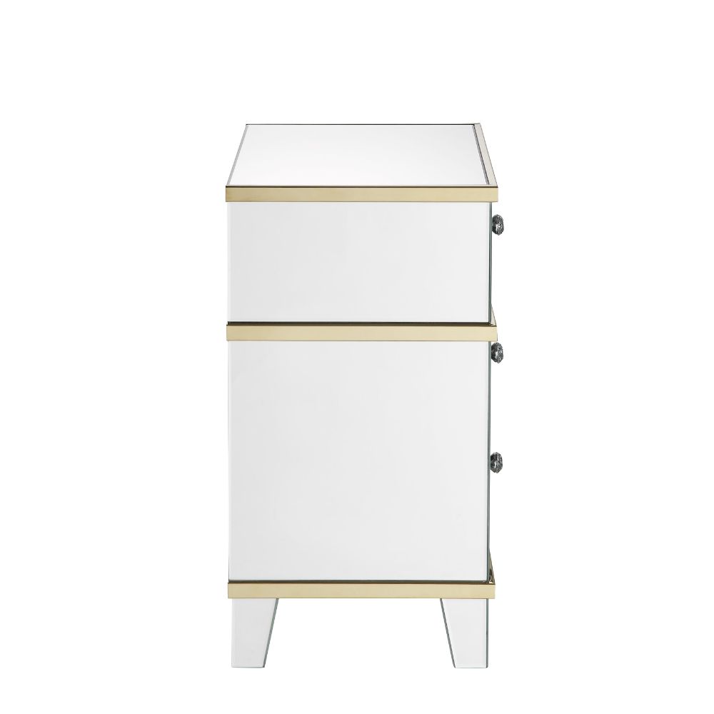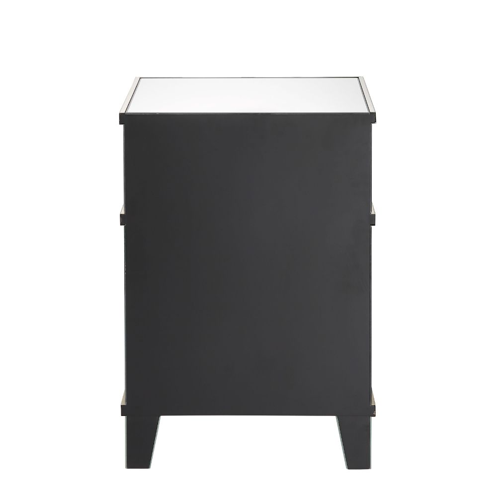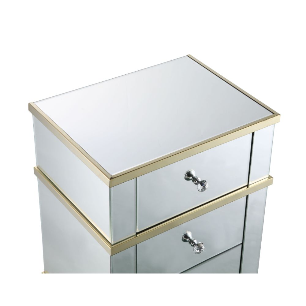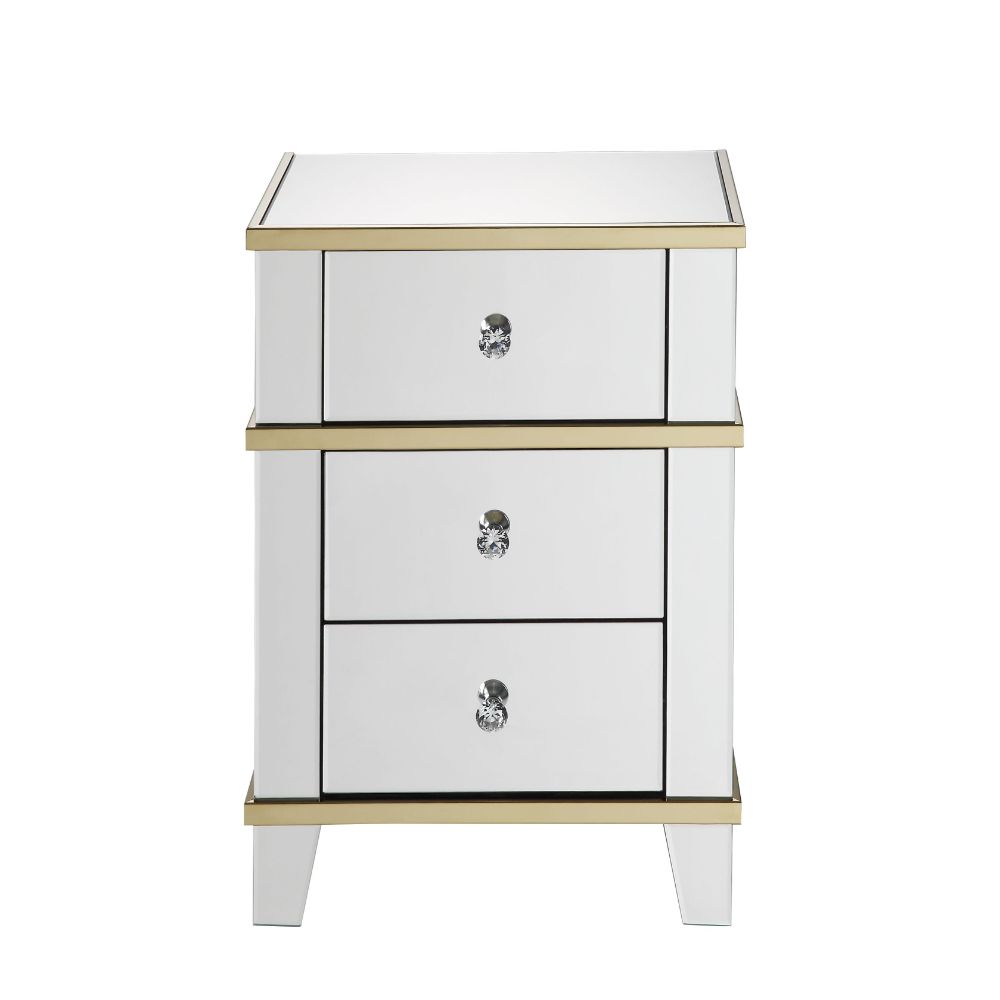 Assambled, Rectangular Night Table Mirrored Finish: Beveled (Back Unfinished) Orientation: Free Standing Storage: 3 Drawers (Back Panel: Unfinished) CONSTRUCTION Mirrored Case-Frame with Titanium Stainless Steel Trim: Mirror, MDF Mirrored Tapered Leg: Mirror, MDF, Leg Size: 4 Inches Height Mirrored Front Drawer: GLIDE Side Metal (2/3 Ext.), DOVETAIL French Front, Felt-Lined NOT Included, Safety Stop NOT Included, Manual Close, Hardware: Single Knob, Crystal like