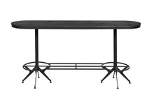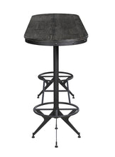 Savor time around this round industrial bar table with loved ones. It showcases a round wood top with wire brushed black tones. The angled legs and footrest are stylishly designed with a warm antique black finish. Stand with one leg on the footrest or slide a bar stool (available separately) up and enjoy yourself. It's the perfect showpiece table for a casual kitchen, home bar, or entertainment area.