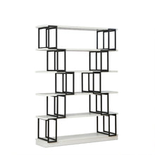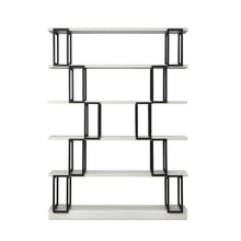 This Verne, modern bookcase gets you organized with style. Our rectangular Etagere bookshelf is made of white wooden top, shelves and base, engineered black metal frame and features geometric shape. With 6 open storage shelves, not only does this modern display shelf house books, but it is also the perfect place to show off your prized vases, decor, and home accents. Add storage and a touch of modern style to your home with this unique modern storage shelf.