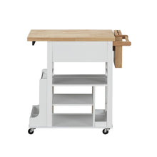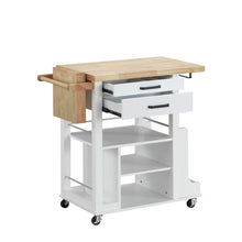 Our Zillah kitchen cart covers your need for storage and more. This multifunctional kitchen cabinet is a freestanding island that features four caster wheels, each with a locking feature so it doesn't slip away while you are chopping fresh herbs and veggies. This kitchen cart features two storage drawers and an integrated knife storage. The frame is made with a white finish, and topping this is a beautiful solid natural wood butcher block countertop.